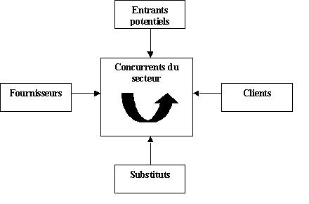 - Concurrents du secteur dont l’importance est déterminée par : la structure de la concurrence (la rivalité sera plus intense s’il y a un grand nombre de concurrents, moins rude si une industrie a un leader), la structure des coûts d’industrie (les industries avec des coûts fixes élevés encouragent des concurrents à fabriquer à la pleine capacité en baissant les prix si nécessaire), le degré de différentiation du produit (plus le produit est banal et plus la concurrence sera rude), les objectifs stratégiques (des stratégies agressives d’évolution entraînent une rivalité plus intense).