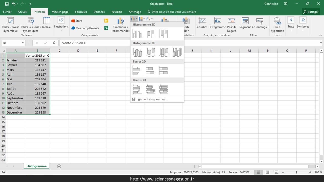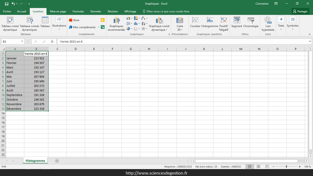 Ce pas à pas pour créer un graphique histogramme est réalisé sous Excel 2016.