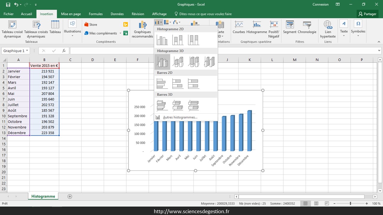 Le menu insertion permet d’accéder directement aux graphiques les plus courants. On ouvre le menu des graphiques histogrammes :