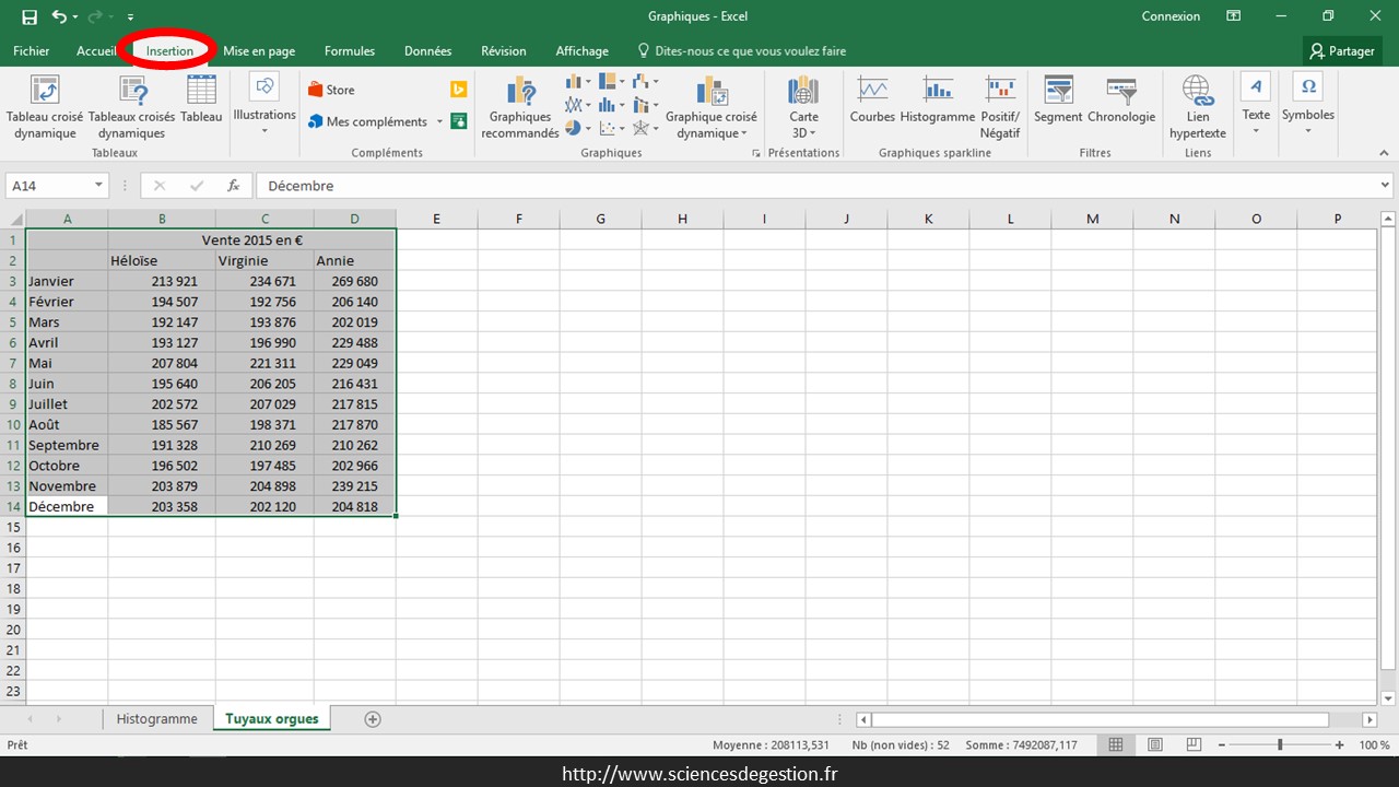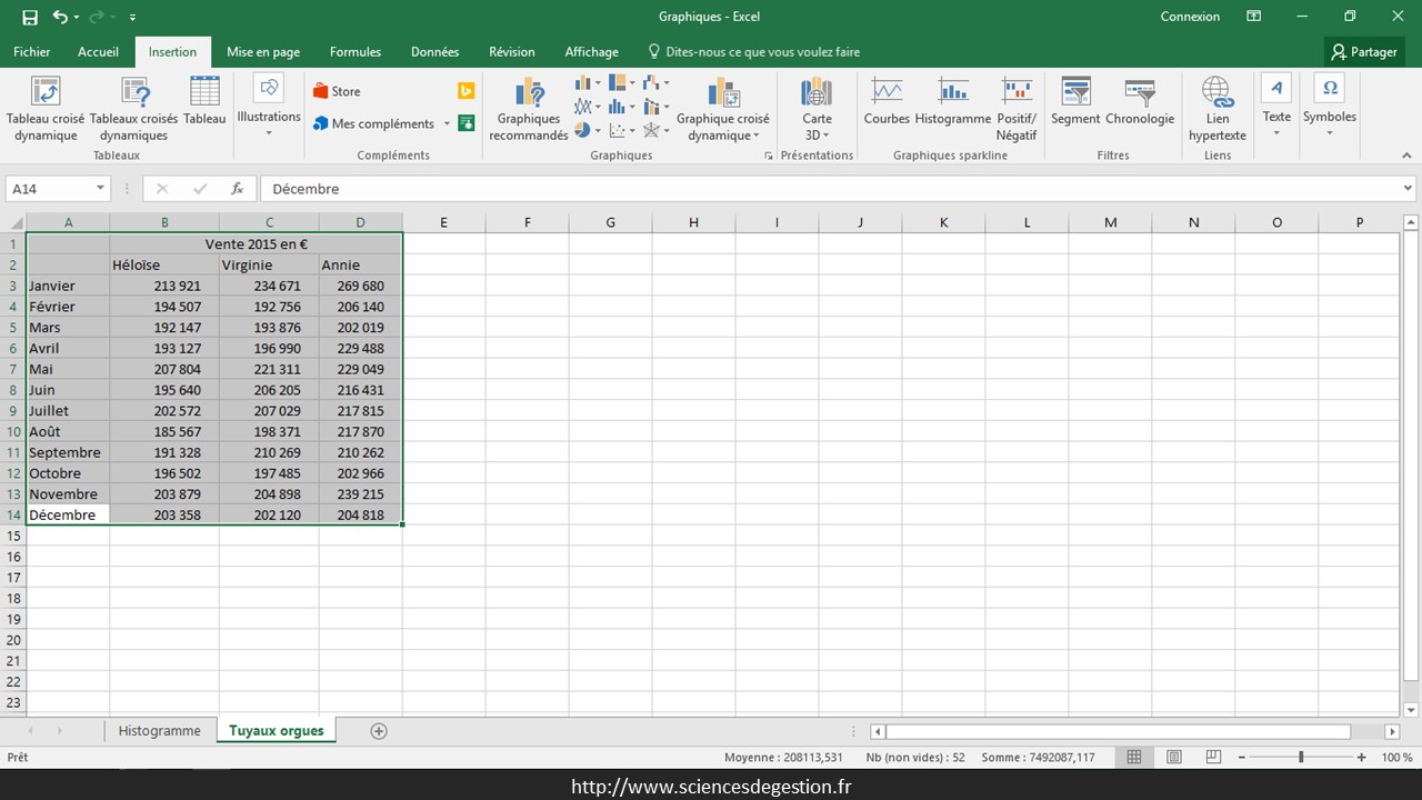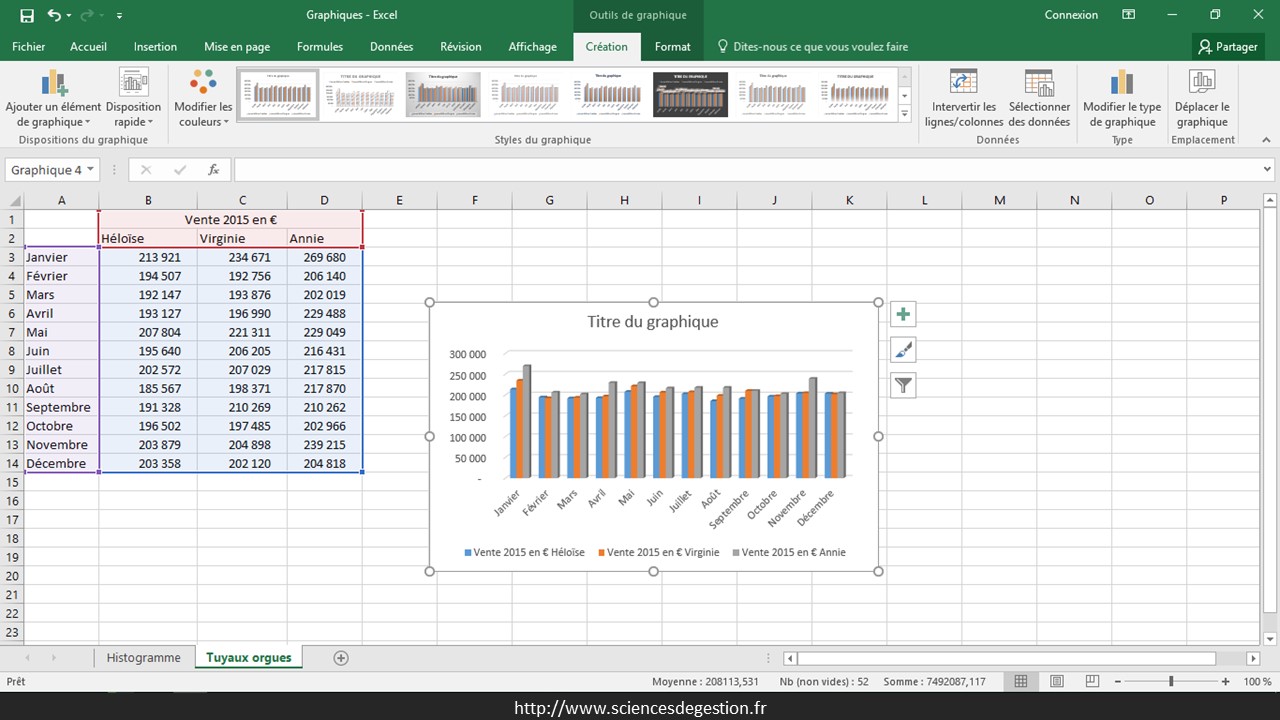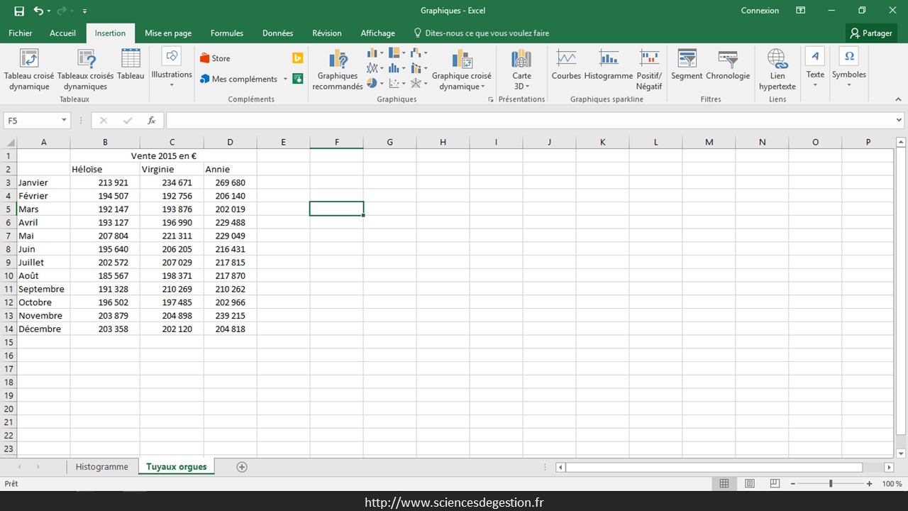 Ce pas à pas pour créer un graphique en tuyaux d’orgue est réalisé sous Excel 2016.