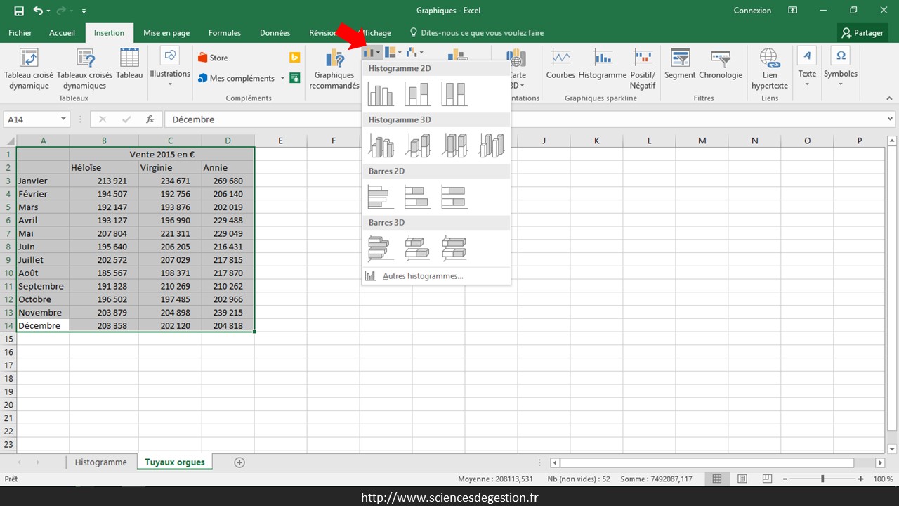 Le menu insertion permet d’accéder directement aux graphiques les plus courants. On ouvre le menu des graphiques histogrammes :