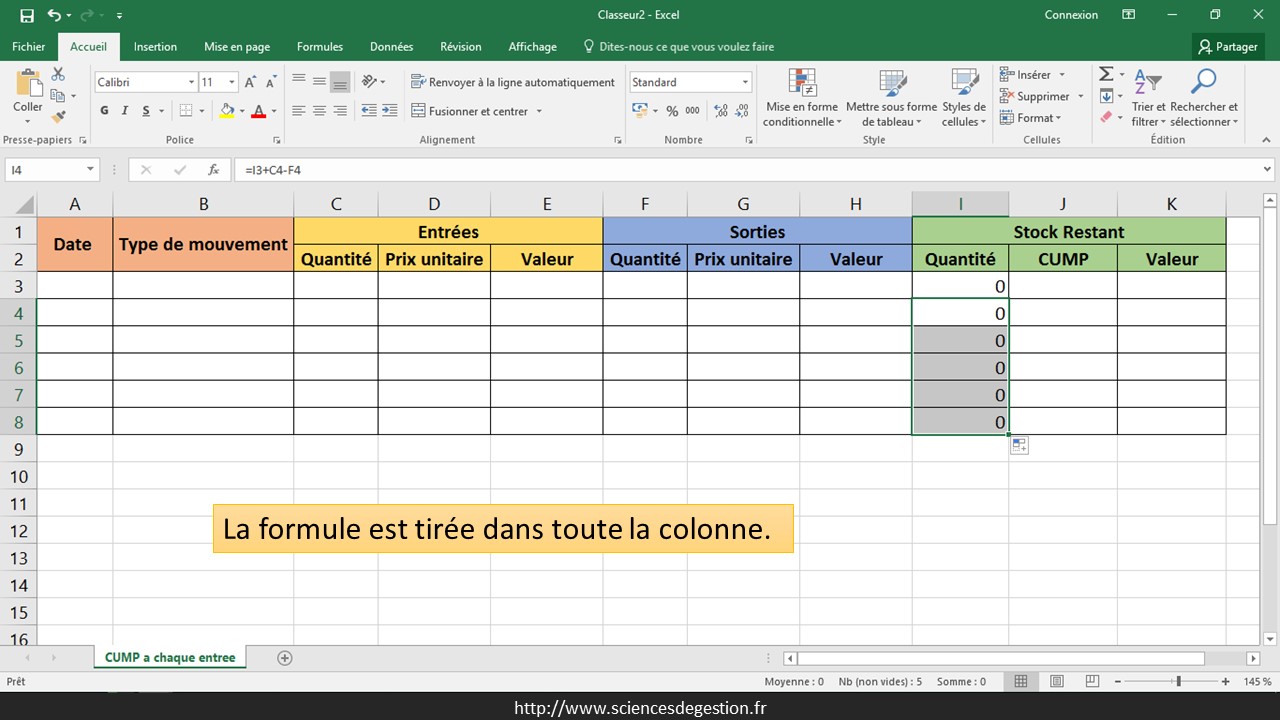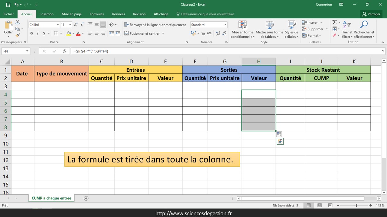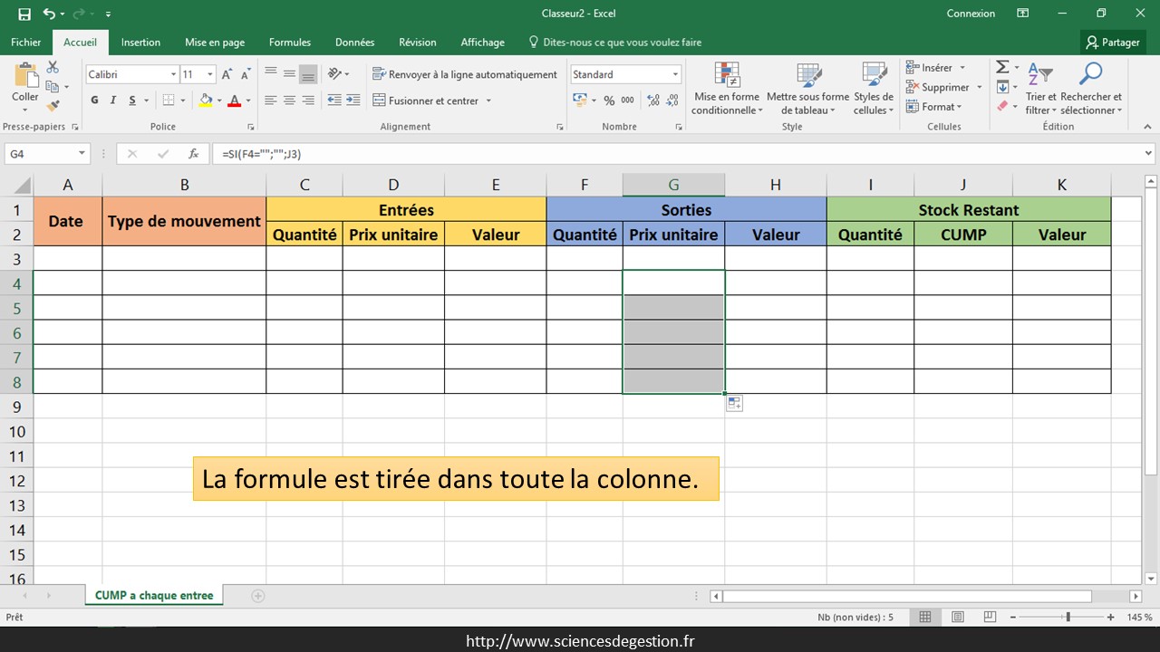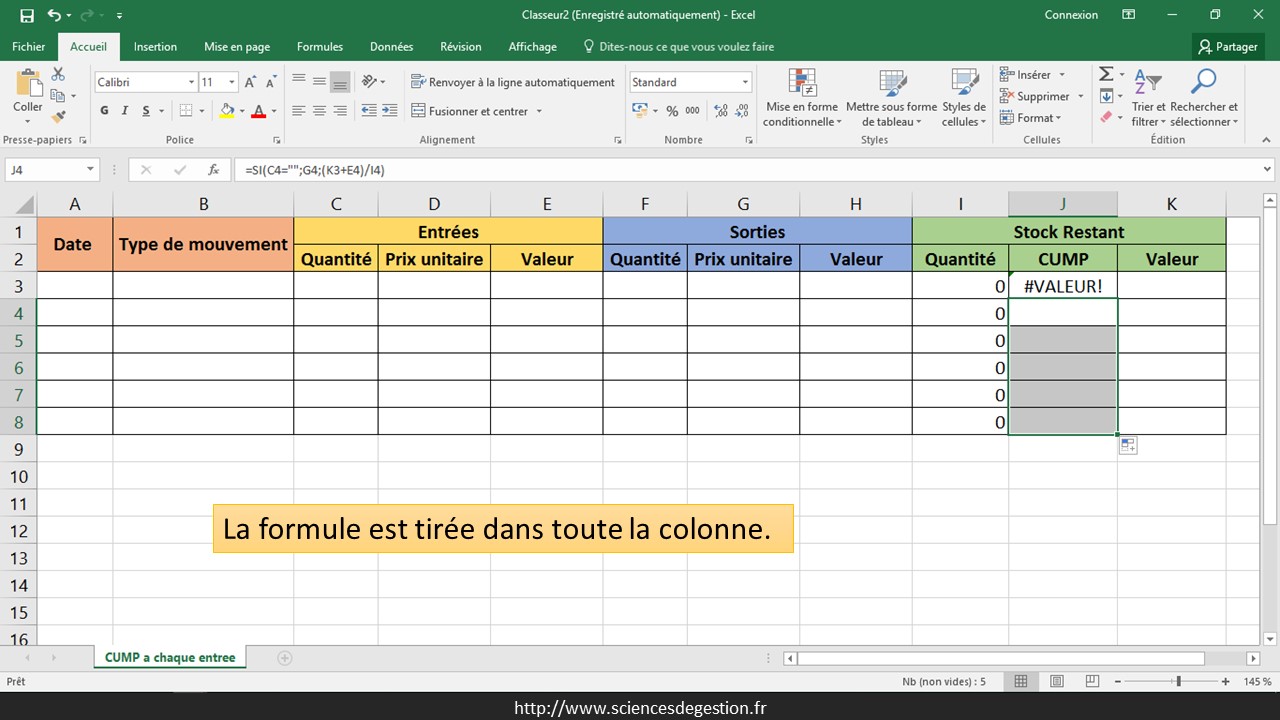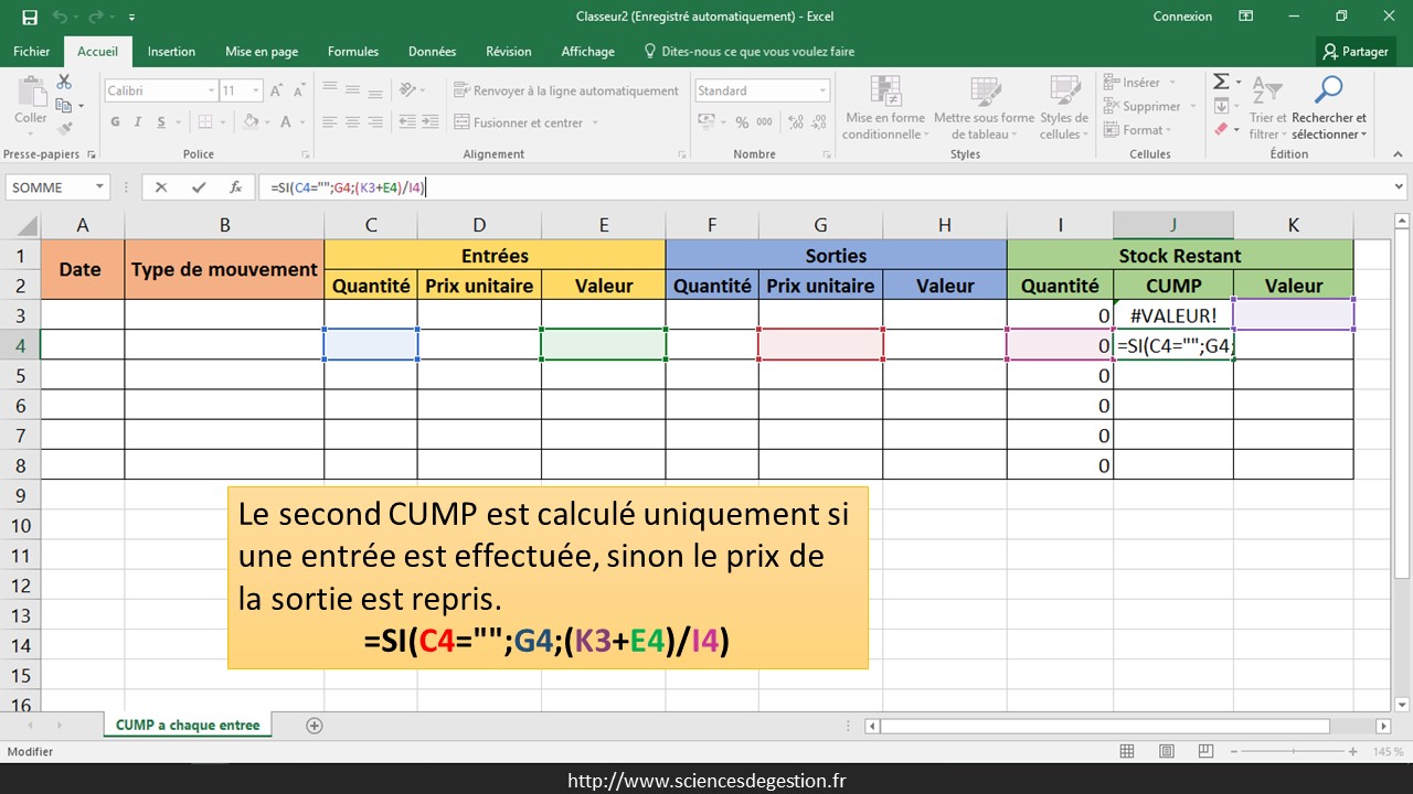 La première ligne des sorties n’est pas paramétrée car le premier mouvement est obligatoirement une entrée (il est difficile de sortir un stock qui n’est pas encore entré). Si une quantité est sortie (F4 non vide), le prix unitaire de cette sortie est pris en compte en récupérant le CUMP du mouvement précédent (J3) : =SI(F4=«»;«»;J3)