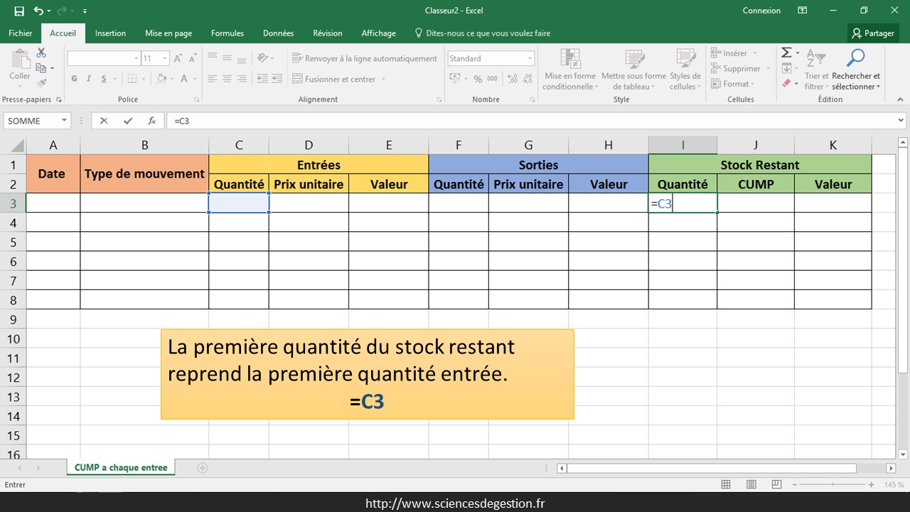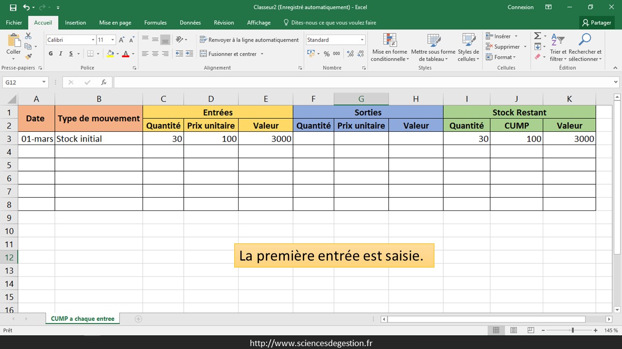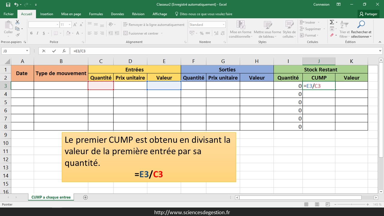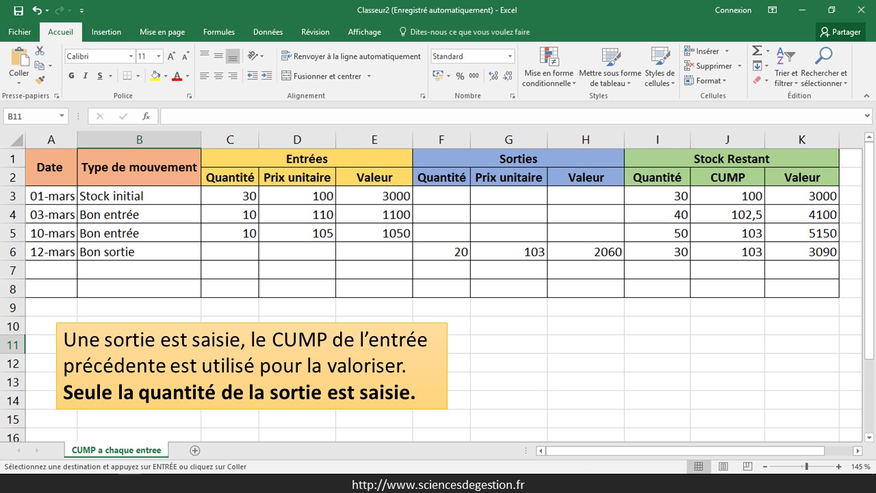 Vous trouverez sur cette page un exemple de création d’une feuille Excel permettant de suivre simplement un stock valorisé en CUMP à chaque entrée.