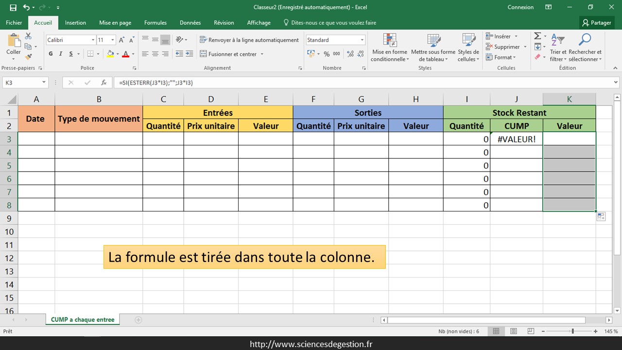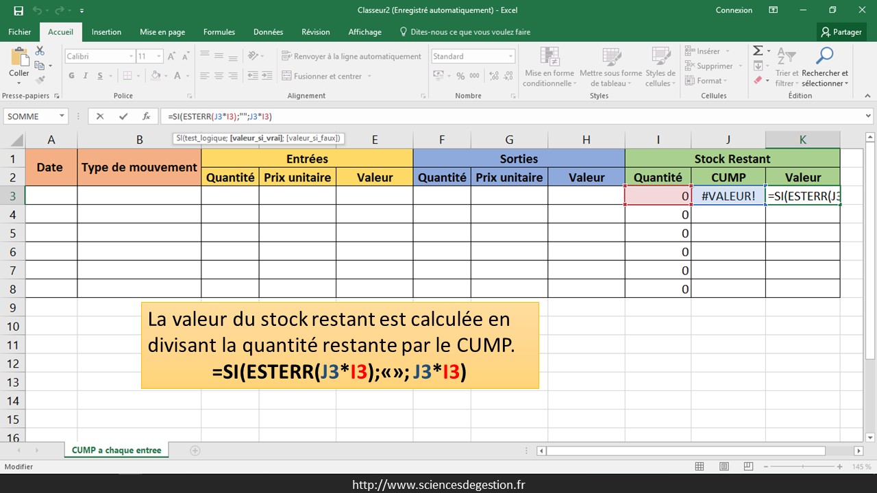 La valeur du stock restant est calculée en divisant la quantité restante par le CUMP. La cellule n’affiche rien si aucun CUMP n’a encore été calculé, ce qui donnerait l’affichage d’une erreur.