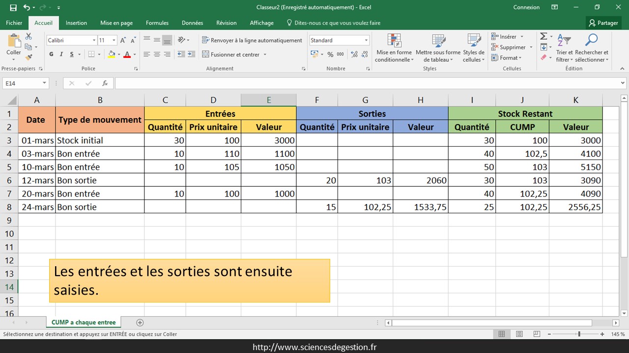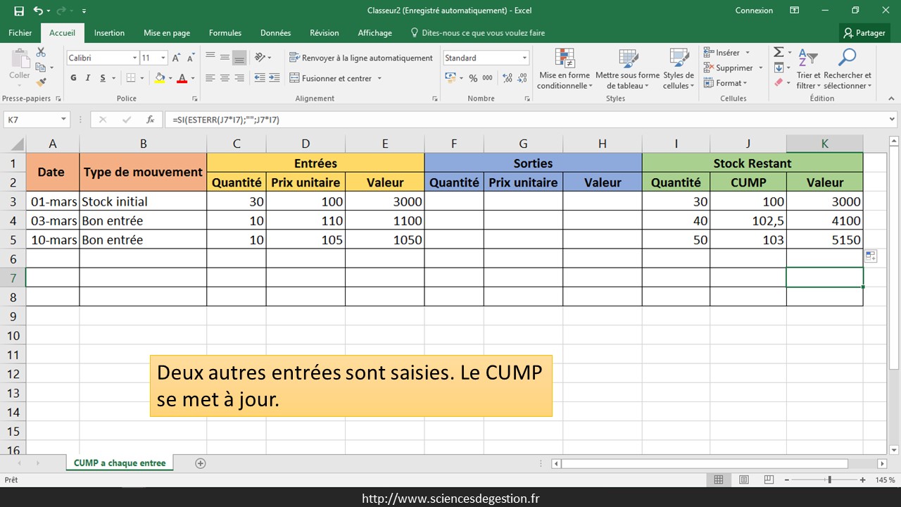 D’autres mouvements sont saisis. Le CUMP est mis à jour à chaque nouvelle entrée et ce CUMP actualisé est utilisé pour les sorties suivantes.