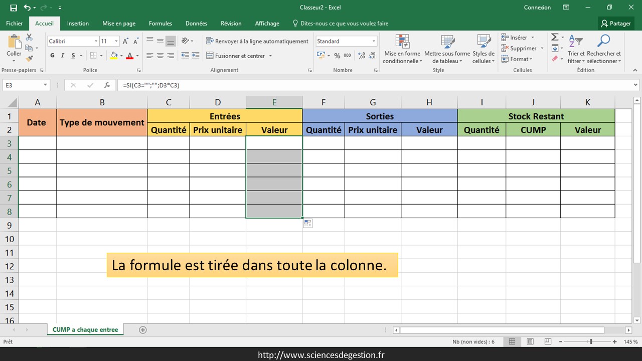 La valeur des entrées est valorisée en multipliant la quantité (C3) par le prix unitaire (D3), uniquement si une quantité est entrée : =SI(C3=“”;“”;D3*C3)
