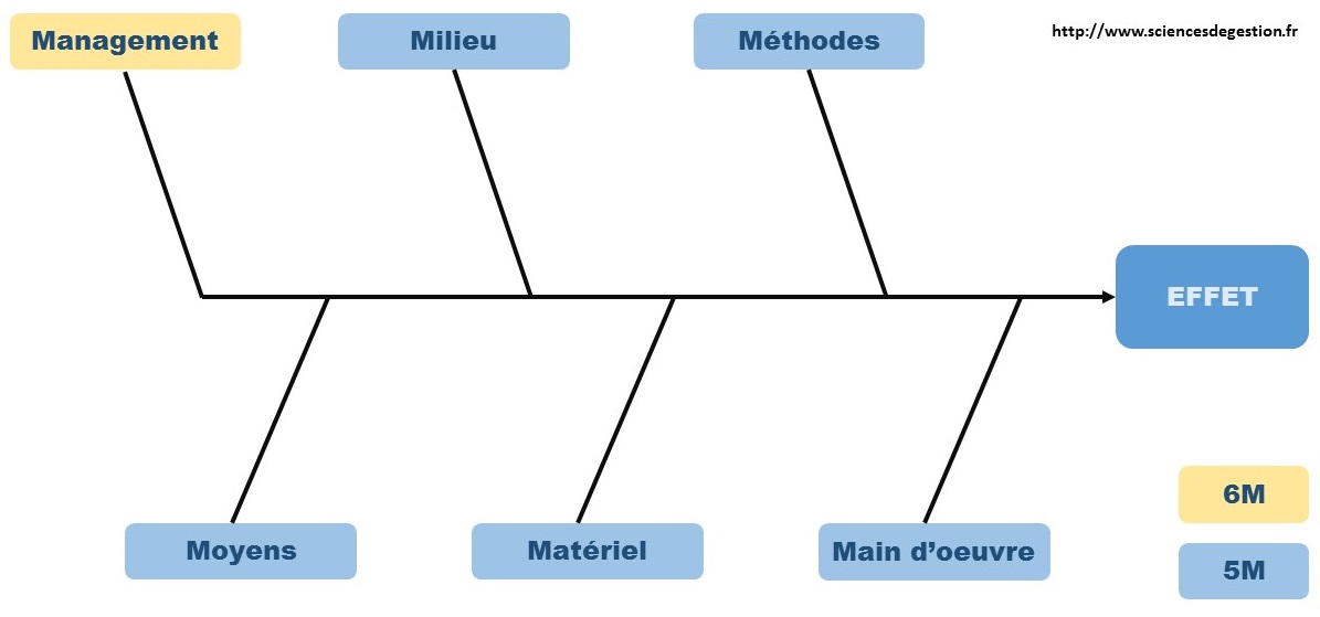 Les causes étaient initialement regroupées par la théorie de 5M : Milieu, Matériel, Main d’oeuvre, Méthodes, Milieu.