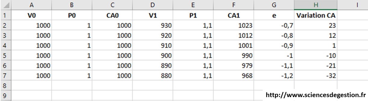 Si e < -1, la perte en chiffre d’affaires due à la baisse des ventes sera supérieure à la hausse du chiffre d’affaires permise par la hausse des prix, comme le montre la simulation ci-dessous :