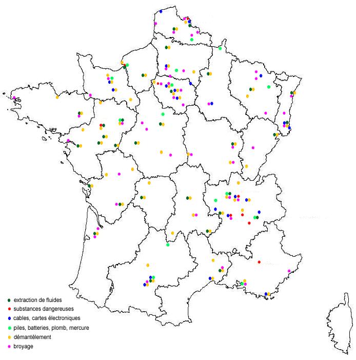 Ces différentes zones sont évidemment semblables aux grands bassins industriels parallèlement desquels les entreprises de récupération se sont développées. La problématique est alors de rapprocher logistiquement ces points de traitement des ménages, responsables de l’entrée dans la filière de 50% des DEEE.