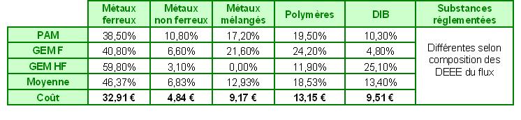 Afin d’établir des projections par matières composant cette collecte généraliste, il est nécessaire de connaître la composition du flux collecté. Seule l’étude de la Screlec offre une décomposition des flux permettant une approximation du coût de collecte par matière.