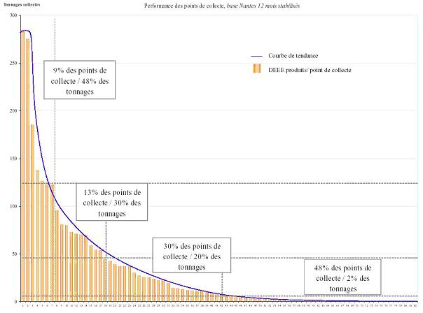 fait naître une difficulté mise en évidence lors de l’étude nantaise de la Screlec. « Initiative recyclage » montre en effet qu’une loi de Pareto s’applique au niveau de la collecte, 22% des points de collecte générant 78% du tonnage collecté.