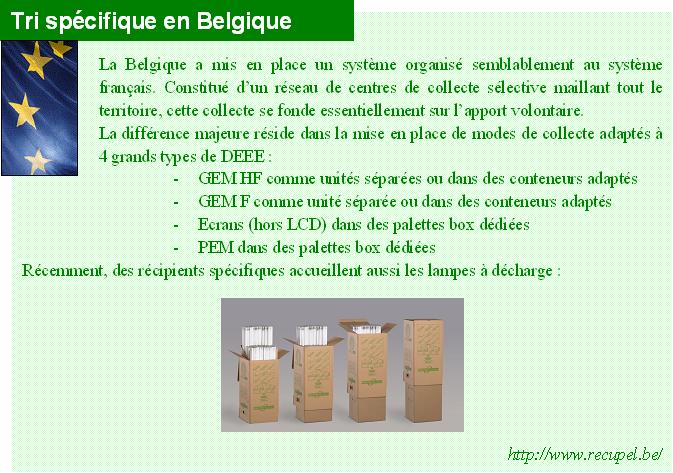 Lors de l’étude de Screlec, la grande majorité des DEEE furent collectés en bennes ou à l’unité. Il convient donc de noter que cette collecte était constituée de produits en vrac. Une collecte plus sélective est à envisager afin de supprimer la phase de regroupement à l’image de l’exemple belge.