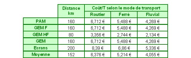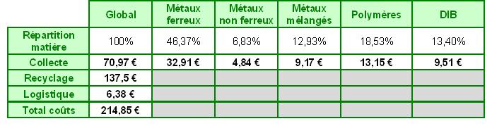 On constate donc un coût global à la tonne de 214,85 € pour les activités de la filière, ce coût étant considéré dans un environnement logistique optimal. Les coûts des extrémités de la filière sont à court terme figés car les modes de collecte et les techniques de recyclage n’évolueront pas dans un court laps de temps. Seul le niveau logistique est donc susceptible de générer des économies.